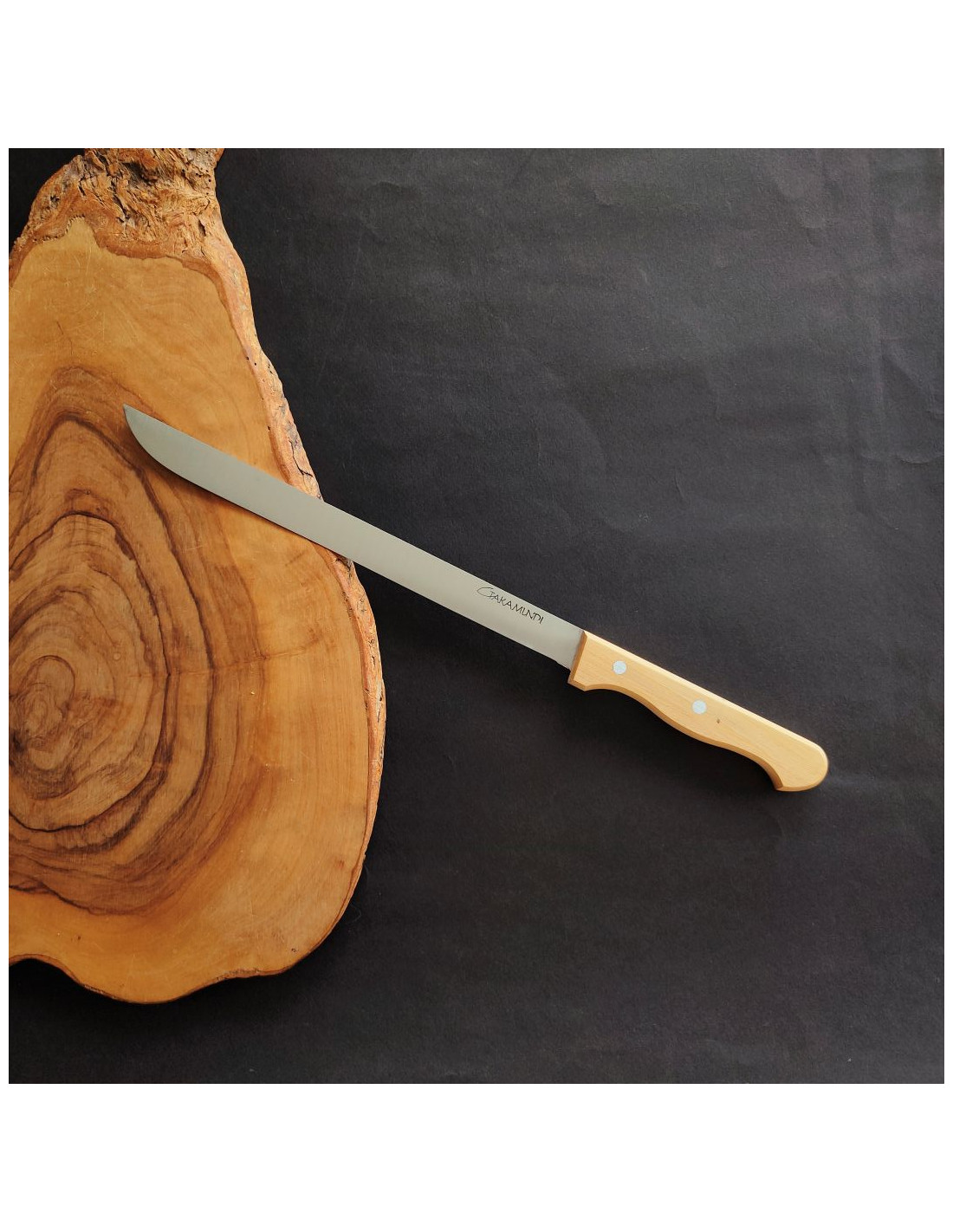 Este modelo de cuchillo, como su propio nombre indica es ideal para cortar jamón. Tiene el filo flexible y fino.