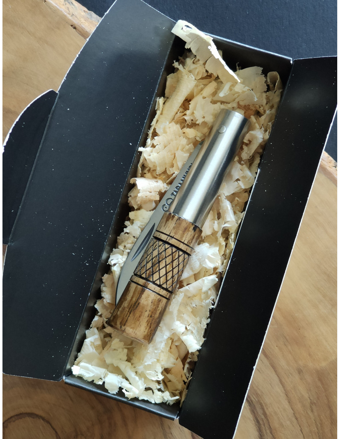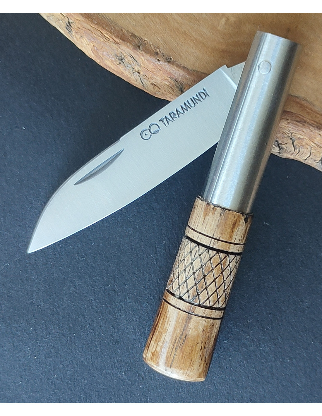 Empuñadura en madera de castaño (la veta y el tono pueden variar) decorada con cruzadillo.