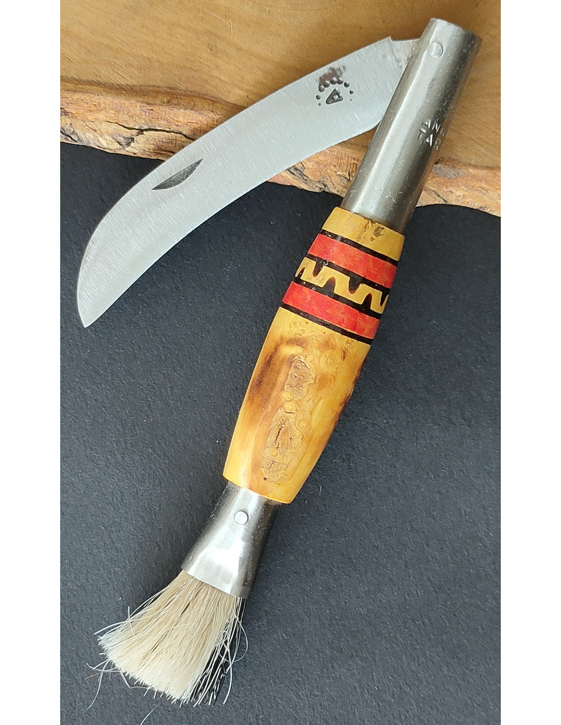 Empuñadura en madera de boj decorada con goma laca. Cuenta con brocha.