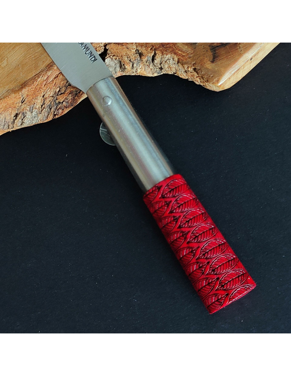 Empuñadura en madera de fresno tintada en tono rojo (la veta y el tono pueden variar) decorada a láser en uno de sus lados con motivo de hojas.