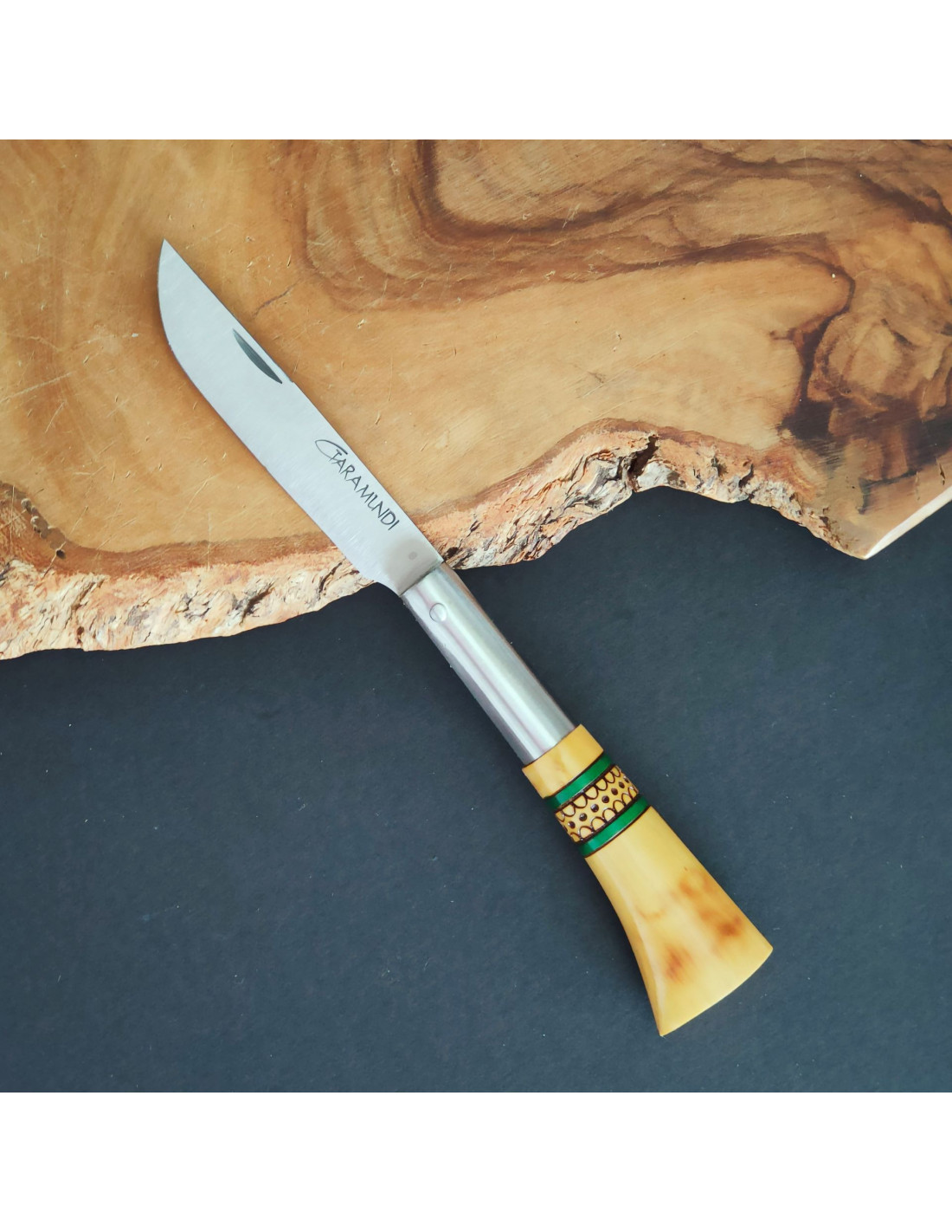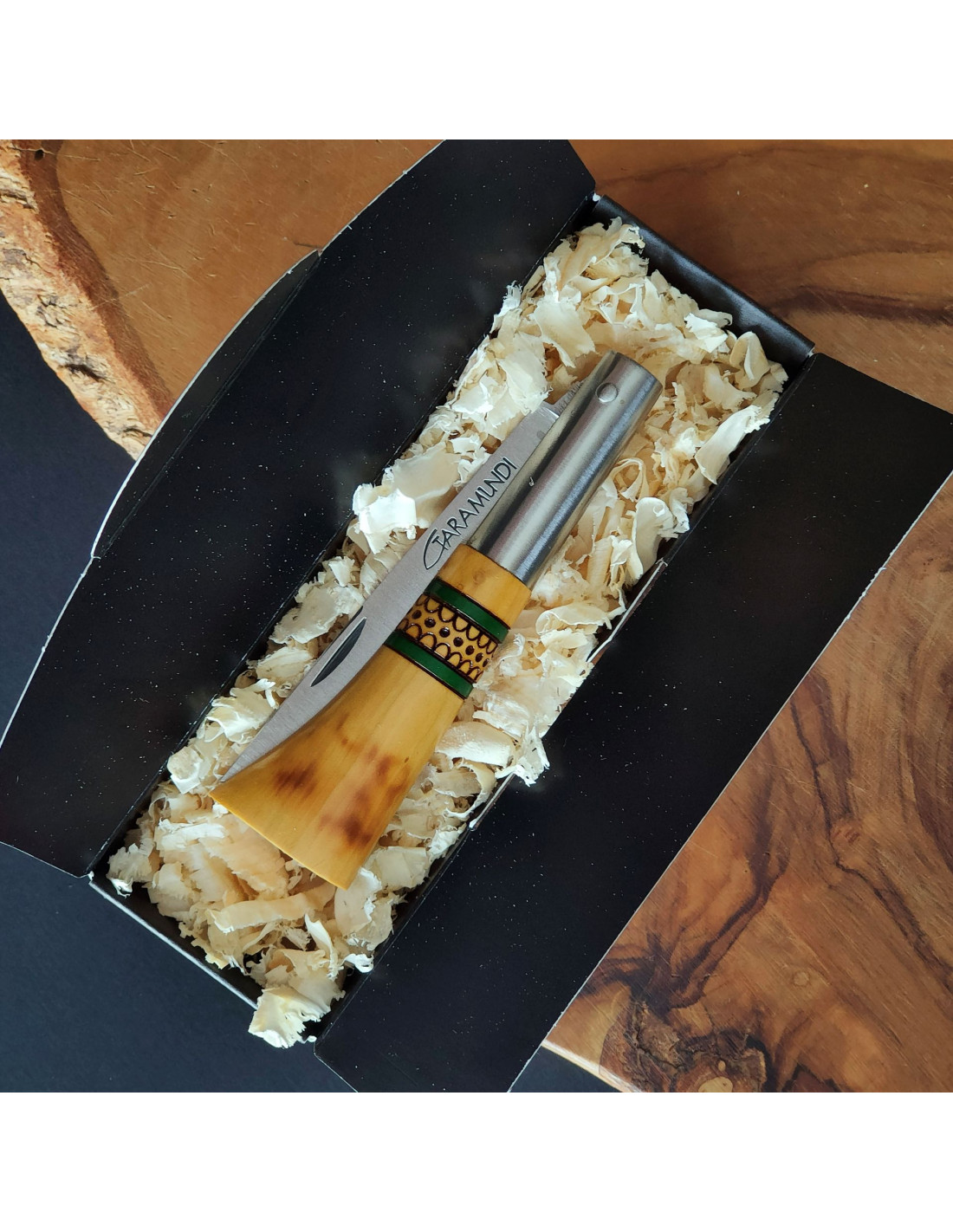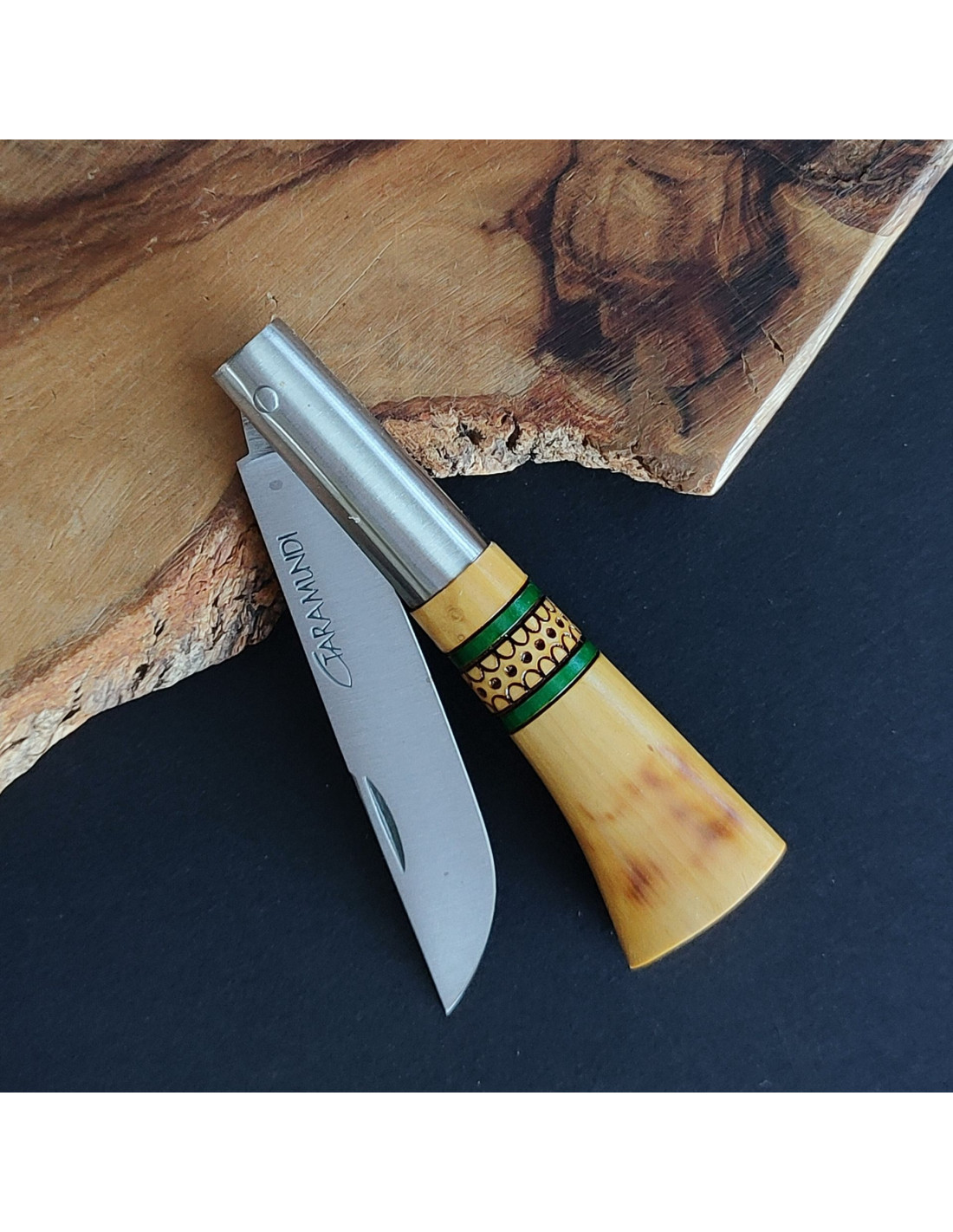 Empuñadura en madera de boj decorada con cenefa en color verde (la veta y el tono pueden variar).