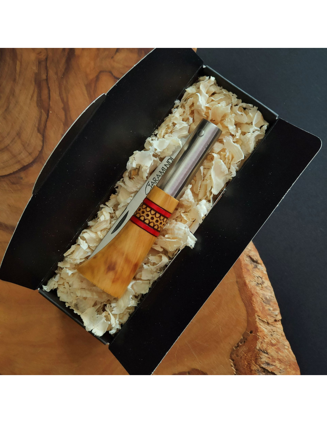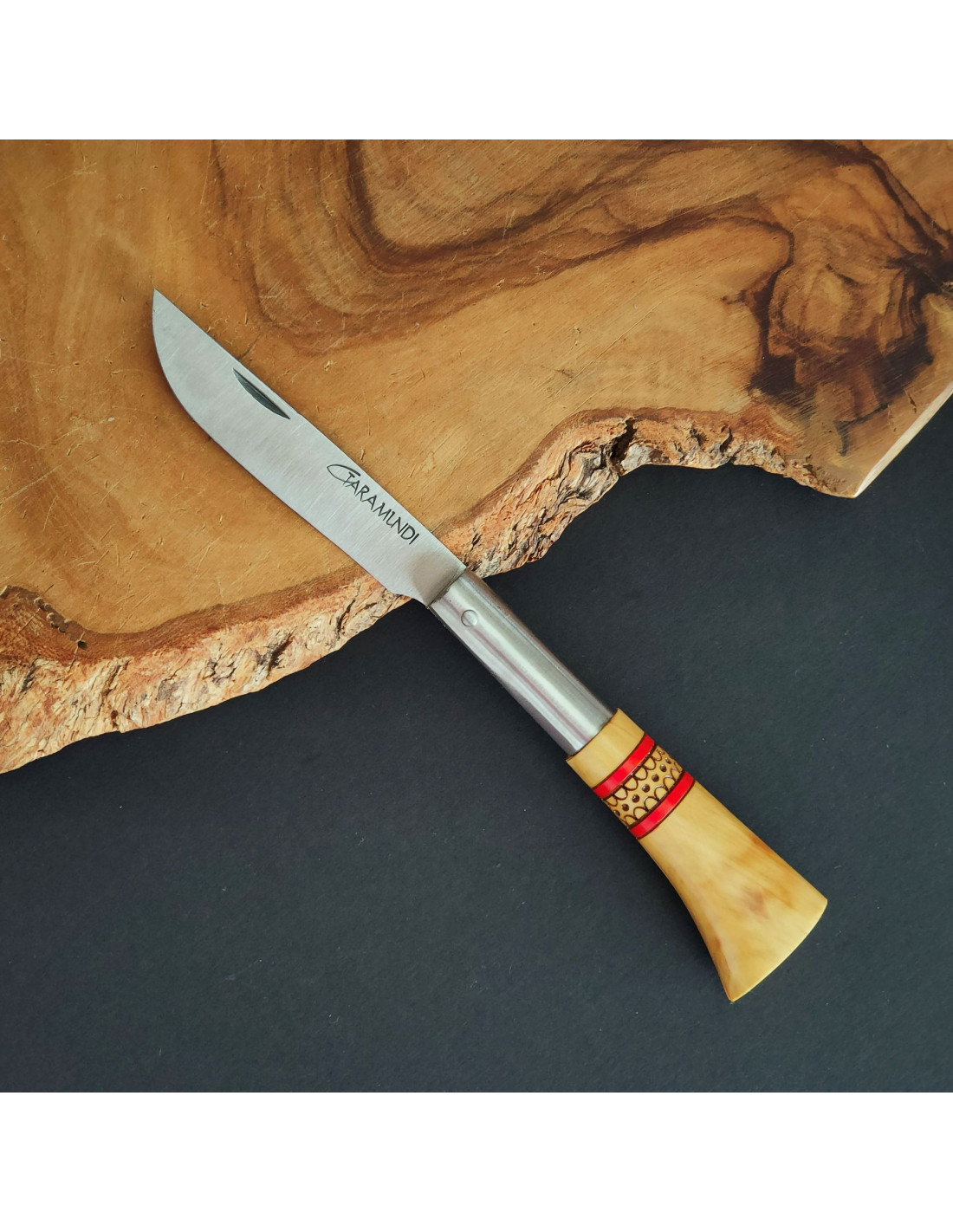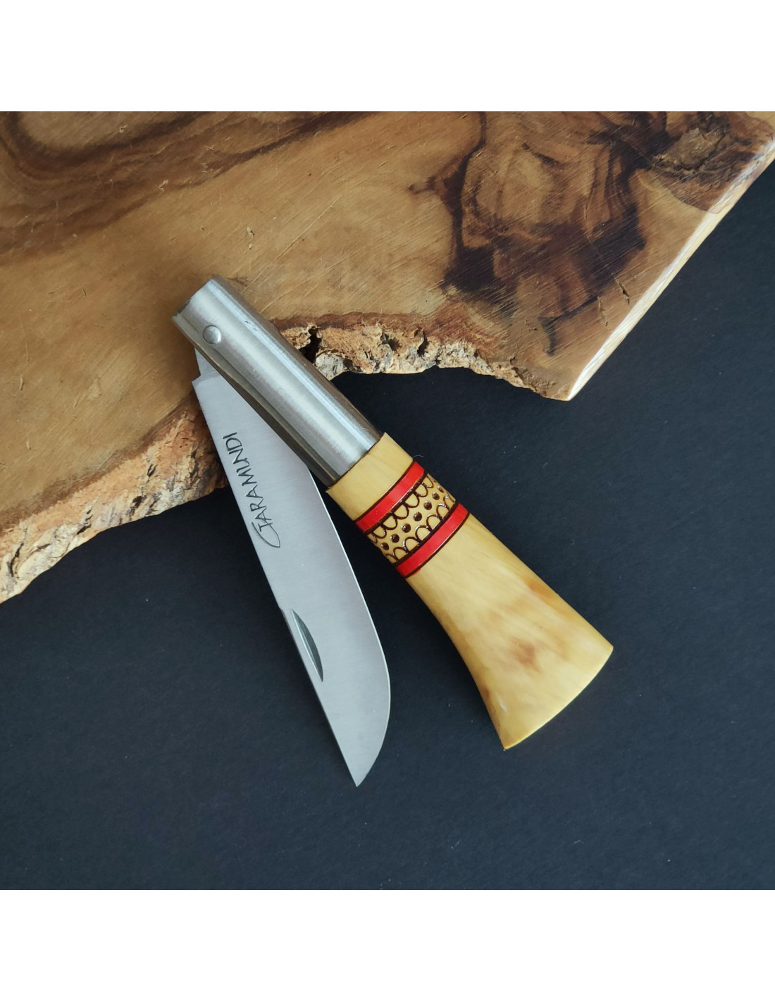 Empuñadura en madera de boj decorada con cenefa en color rojo (la veta y el tono pueden variar).