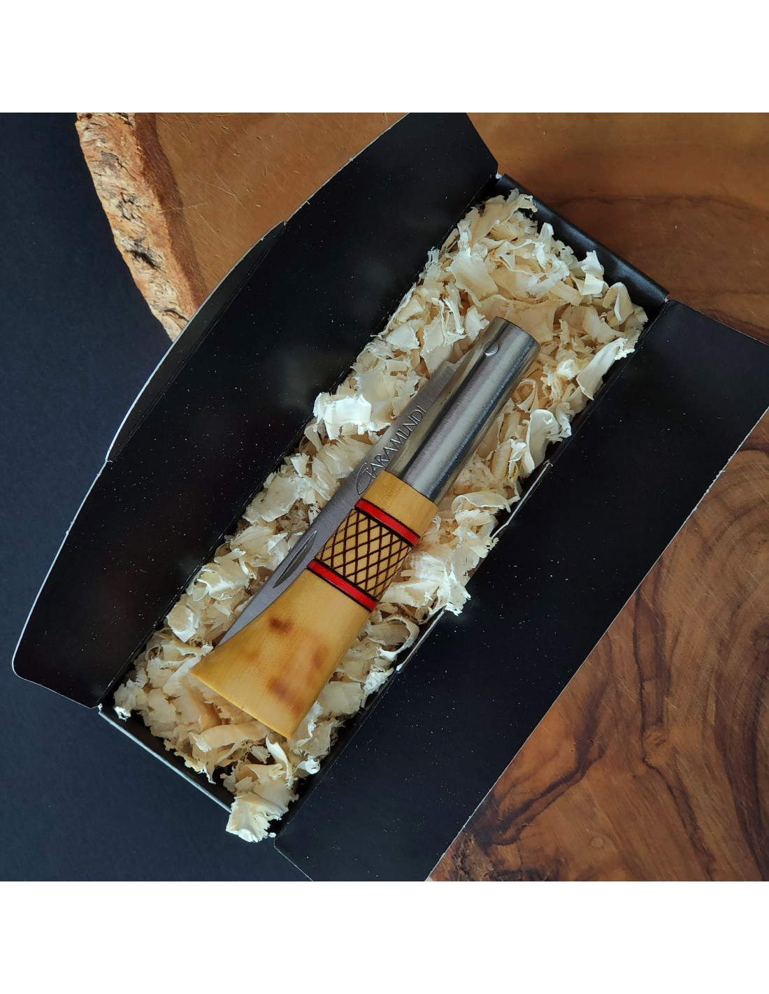 Empuñadura en madera de boj decorada con cruzadillo y cenefas en color rojo (la veta y el tono pueden variar).