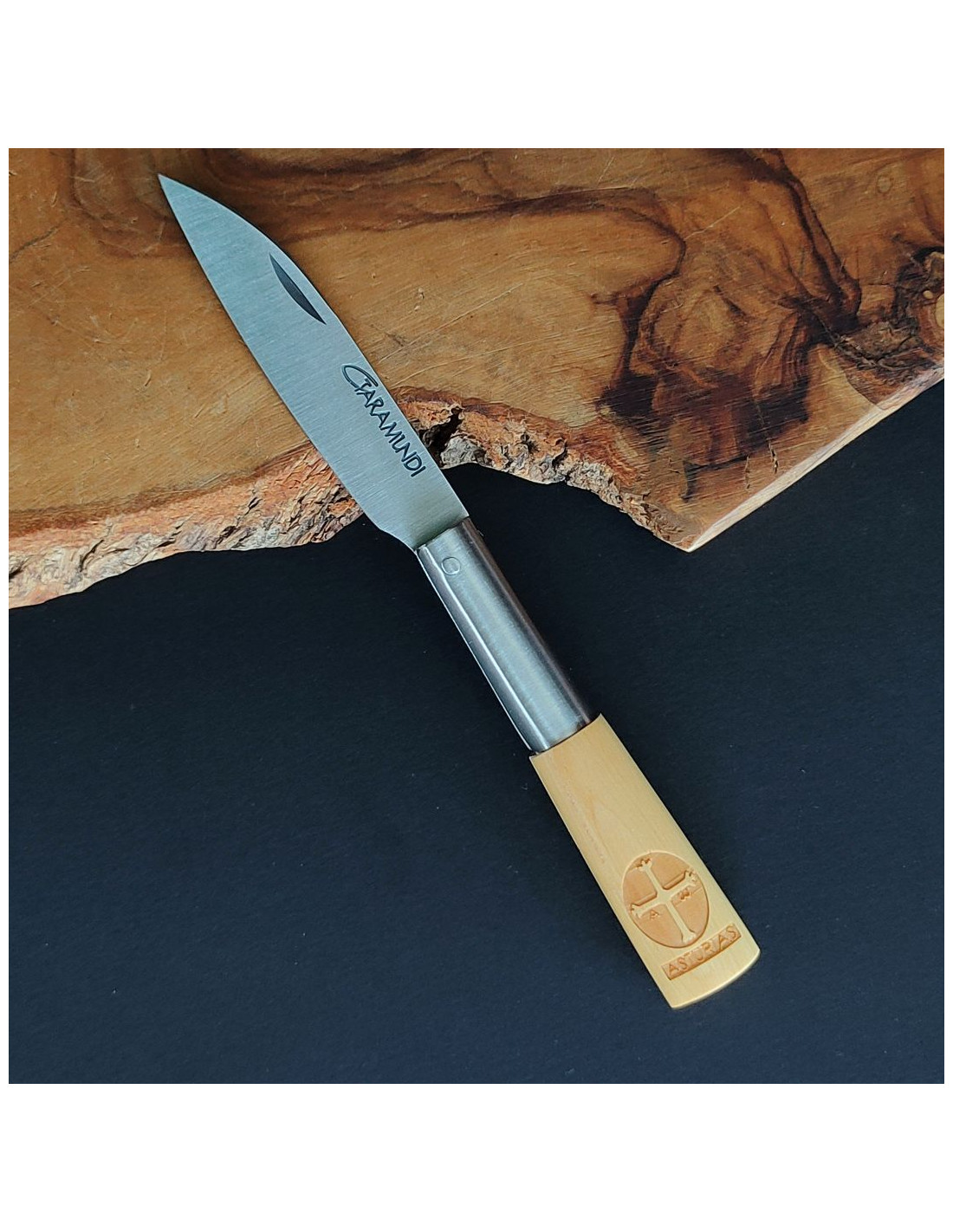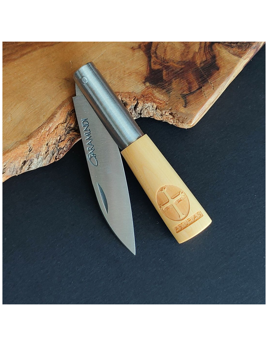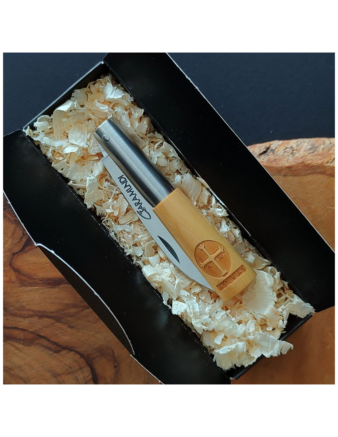 Empuñadura en madera de boj (la veta y el tono pueden variar) decorada con grabado de la cruz de Asturias y ASTURIAS.