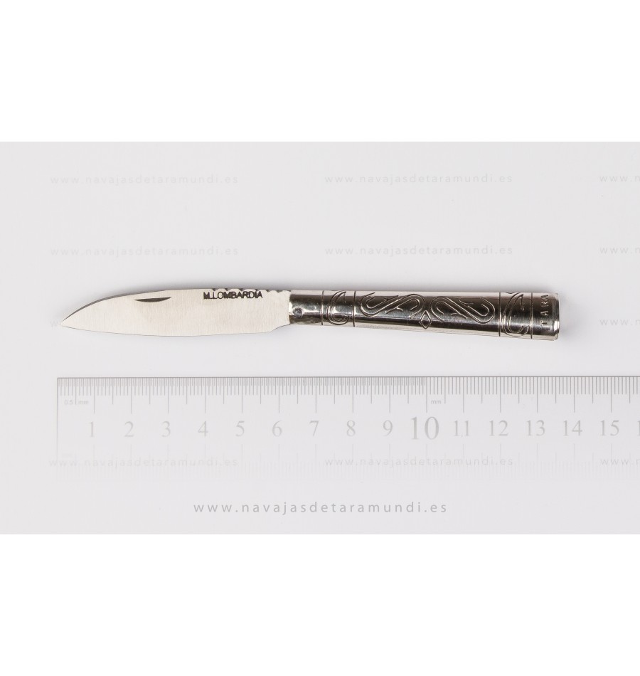 Empuñadura de plata con decoración estampada e interior sintético (mejora la calidad de la navaja ya que siempre conserva la misma presión sobre la hoja, no aprieta la hoja con la humedad, ni afloja con la calor). Con la inscripción TARAMUNDI en la base.