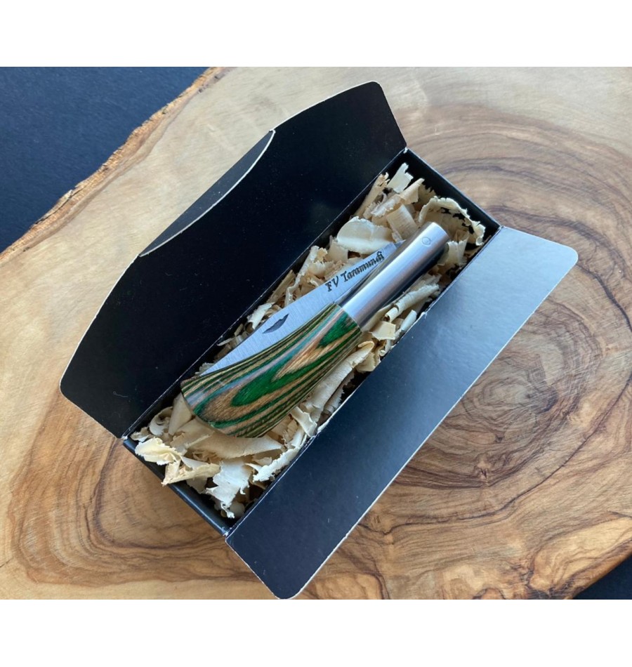 Empuñadura en madera laminada en tonos verde y marrón (la veta y el tono pueden variar).