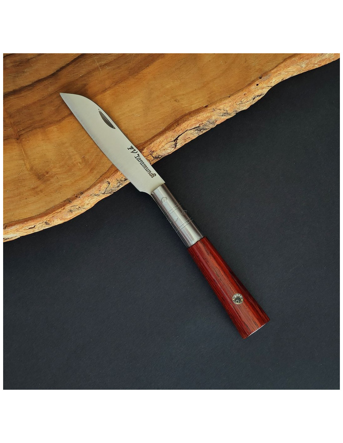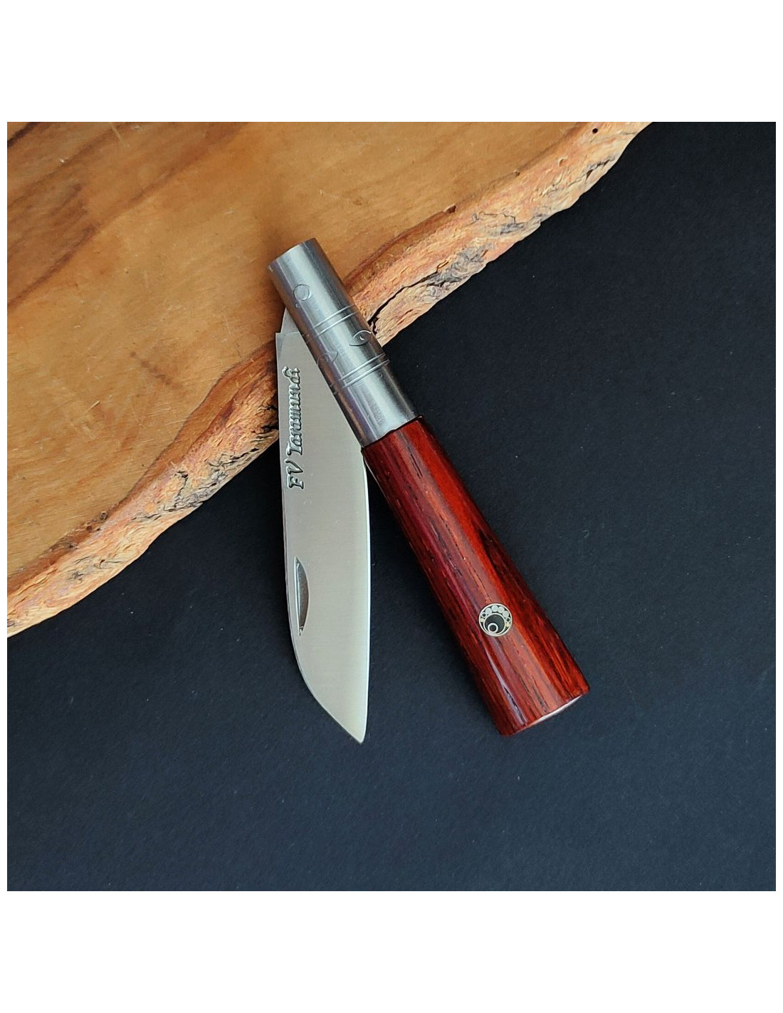 Empuñadura en madera de cocobolo con incrustación de mosaic pin en uno de los lados (la veta y el tono pueden variar).