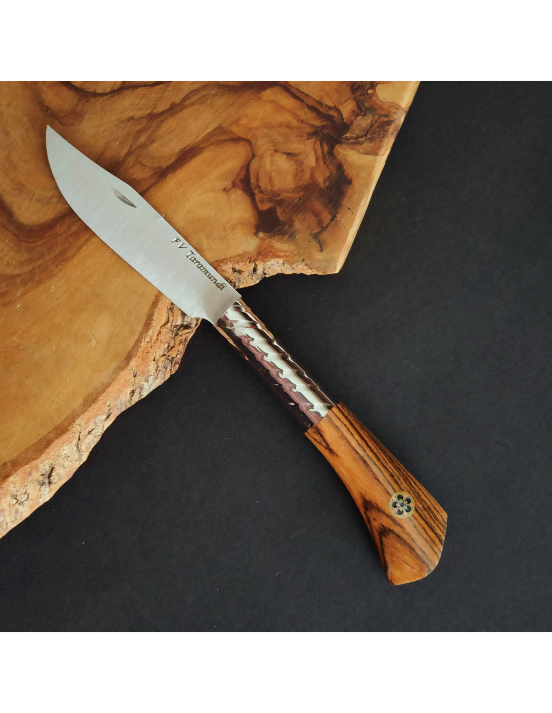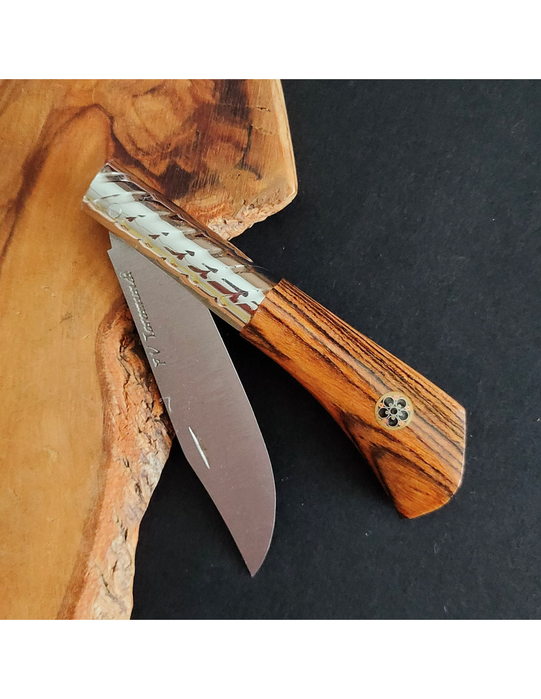 Empuñadura en madera de zebrano (la veta y el tono pueden variar) con incrustación de mosaic pin en uno de los lados.