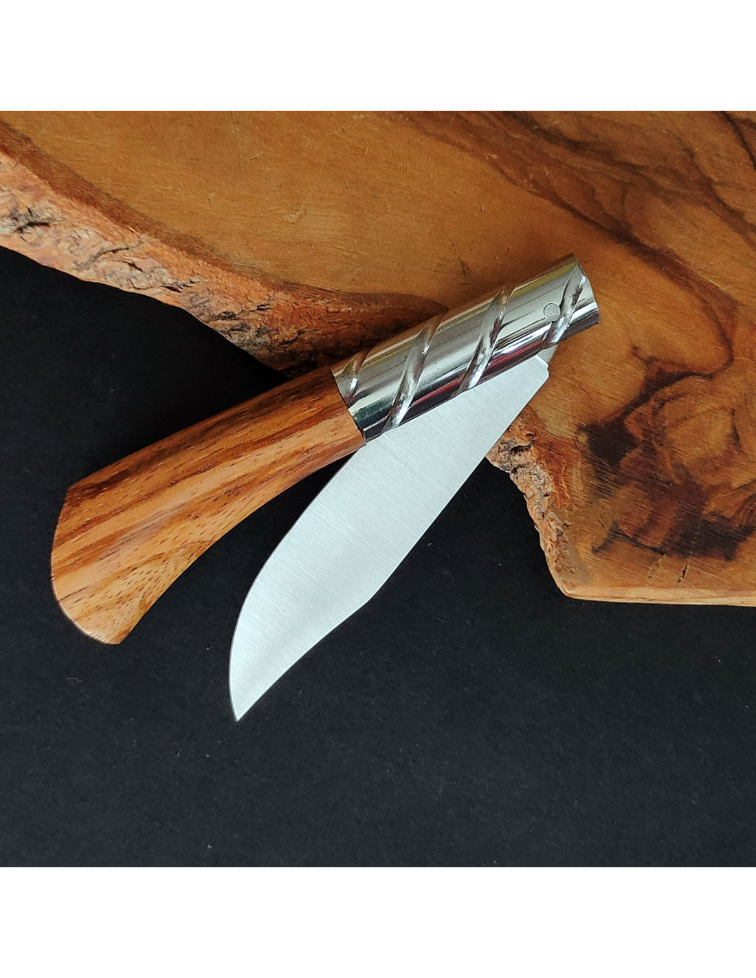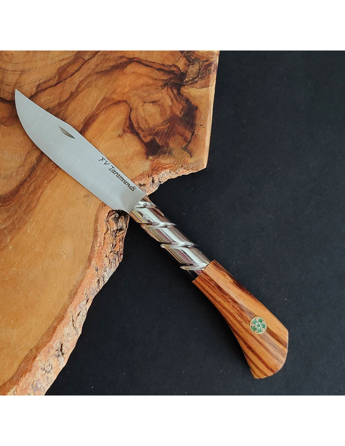 Empuñadura en madera de zebrano (la veta y el tono pueden variar) con incrustación de mosaic pin en uno de los lados.