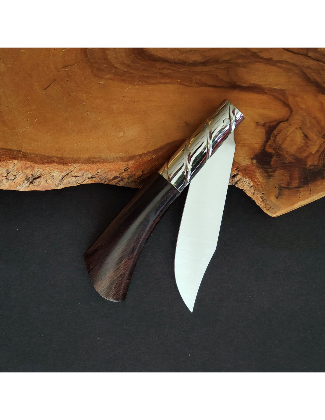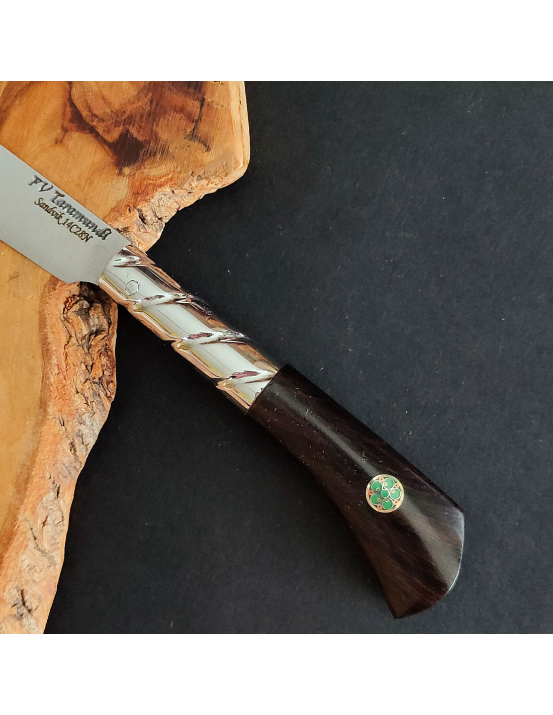 Empuñadura en madera de ébano (la veta y el tono pueden variar) con incrustación de mosaic pin en uno de los lados.