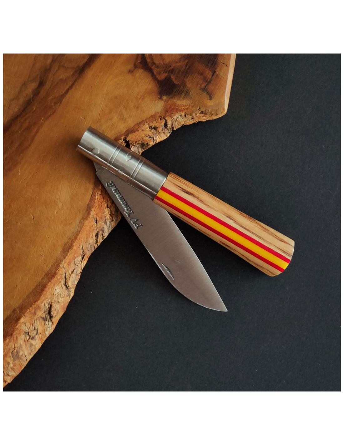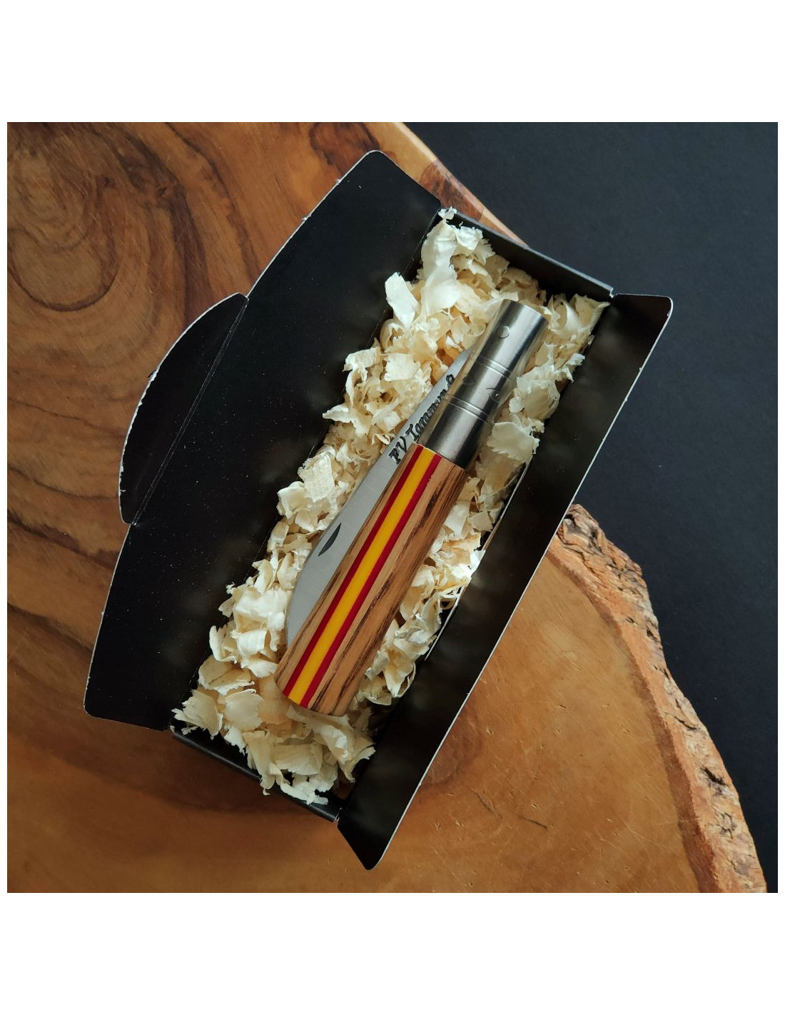 Empuñadura en madera de roble con acabado quemado (el tono y la veta pueden variar) con incrustación de mikarta en un lado de la empuñadura con los colores de la bandera de España.